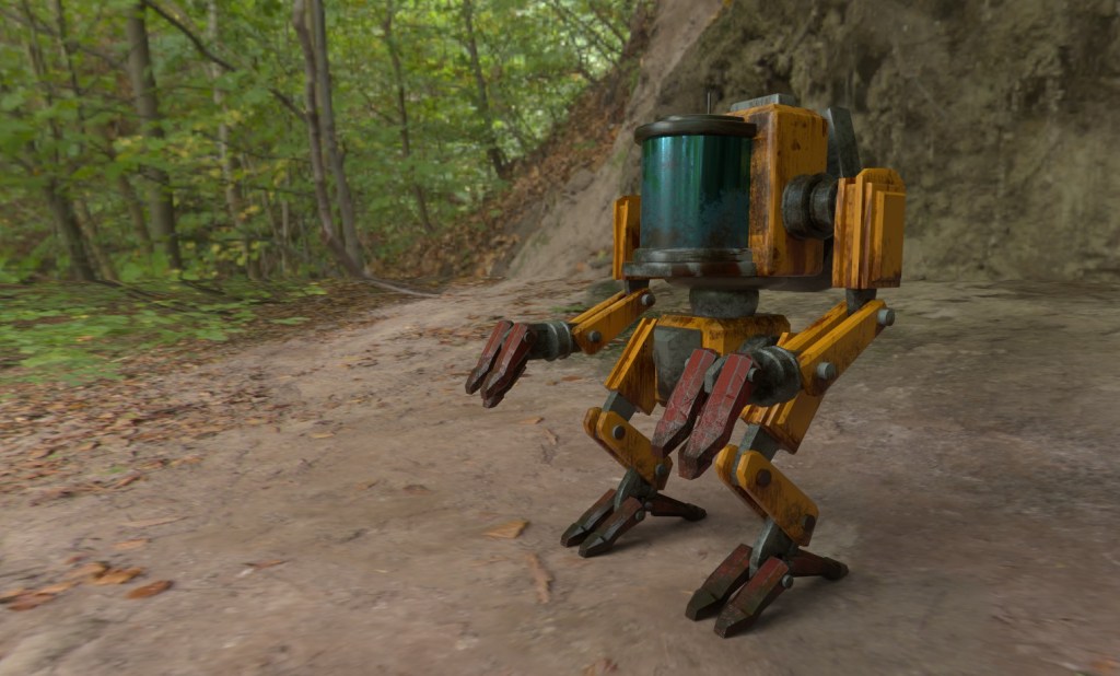 This is a work bot created to handle many tasks like heavy lifting and working in extreme conditions. I’s so durable that it has out lasted the project and company it was made for and has been abandoned in the forest, like a monument to a forgotten industry there. Chances are that it could still be usable, if anyone finds it. Makes you wonder why it was abandoned…